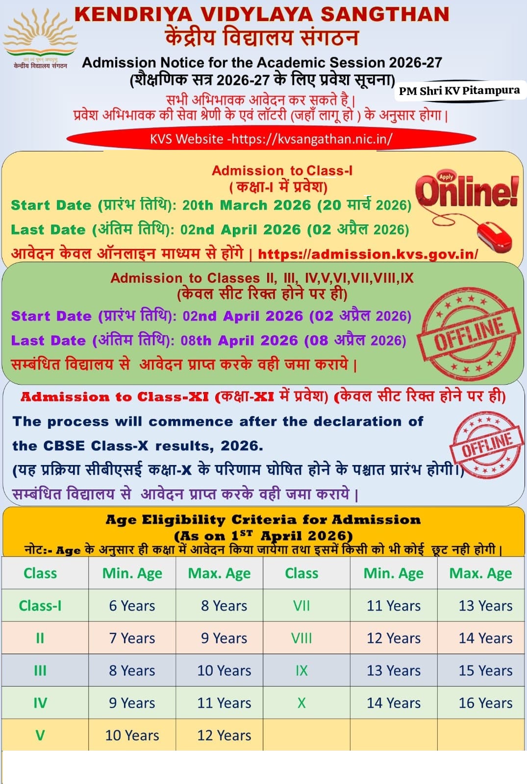 केन्द्रीय विद्यालय संगठन – प्रवेश सूचना 2026-2027.